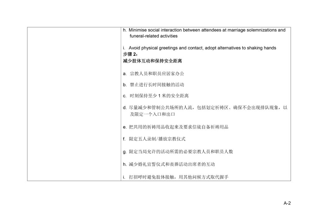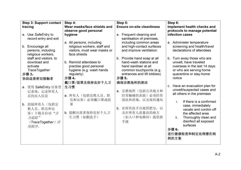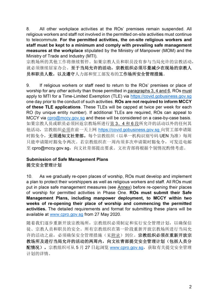 5. 在重开祭拜场所或是开始其他允许的活动两周之内,宗教机构必须向MCCY提交“安全管理计划”(Safe Management Plan)。