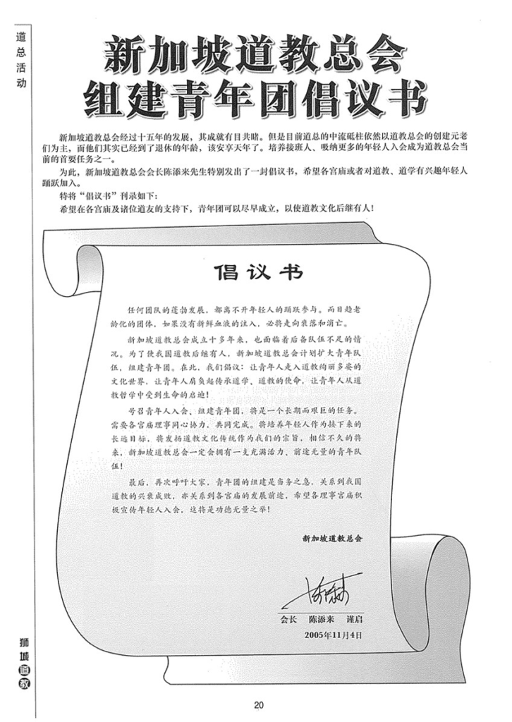 为了进一步推广道教,本会会长陈添来BBM(L)在2005年的 “狮城道教” 里呼吁年轻人向前加入道总。道总青年团就在那一年的筹备组成,目标在于保留道教信仰及推广道教。